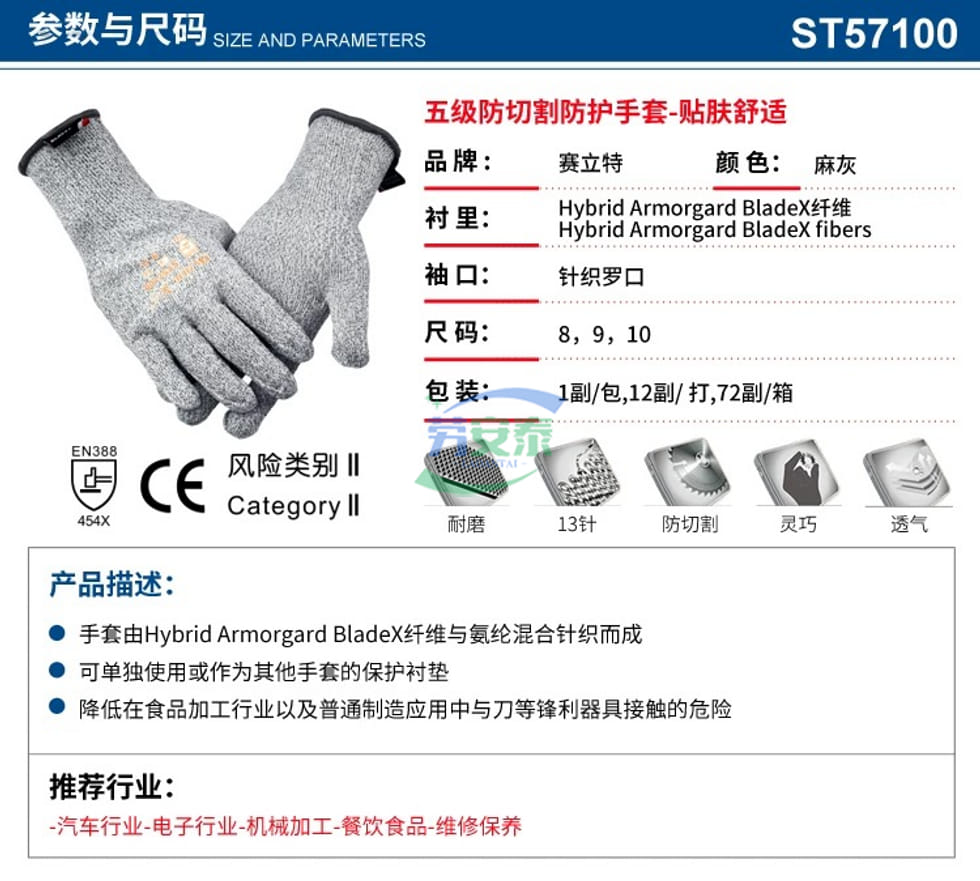 当前位置: 首页 / 个人防护 / 手部防护 / 赛立特ST57100 5级防割手套耐磨抗切割工作手套