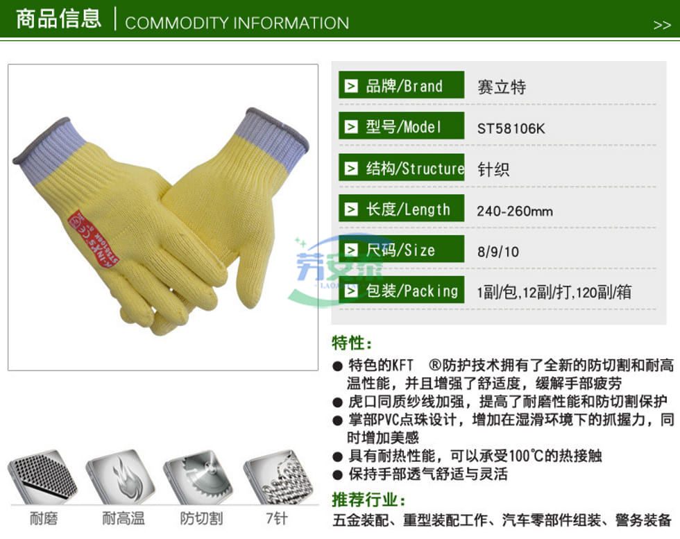 当前位置: 首页 / 个人防护 / 手部防护 / 赛立特ST58106K 5级防割手套+100℃耐热KFT®耐高温5级防割手套