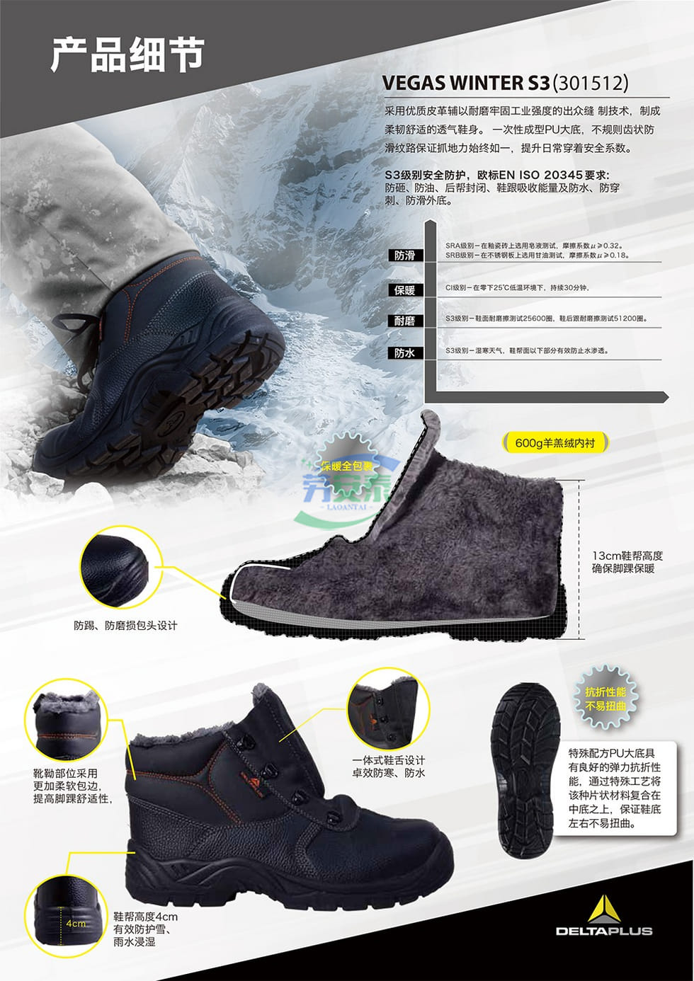 当前位置: 首页 / 个人防护 / 足部防护 / 代尔塔301512 VEGAS S3 防砸防刺穿防静电安全鞋加绒保暖款 印度水牛皮SRC防滑底