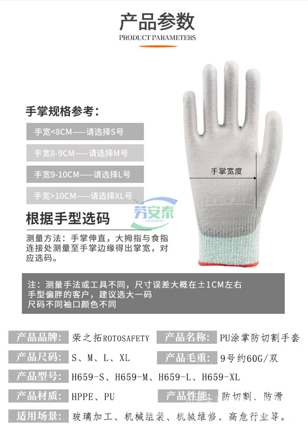 当前位置: 首页 / 个人防护 / 手部防护 / 荣之拓H659 PU防切割手套 HPPE纤维5级防割 弹性袖口透气防滑 耐磨耐用